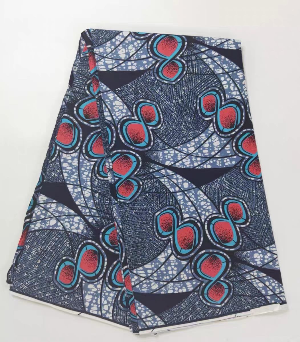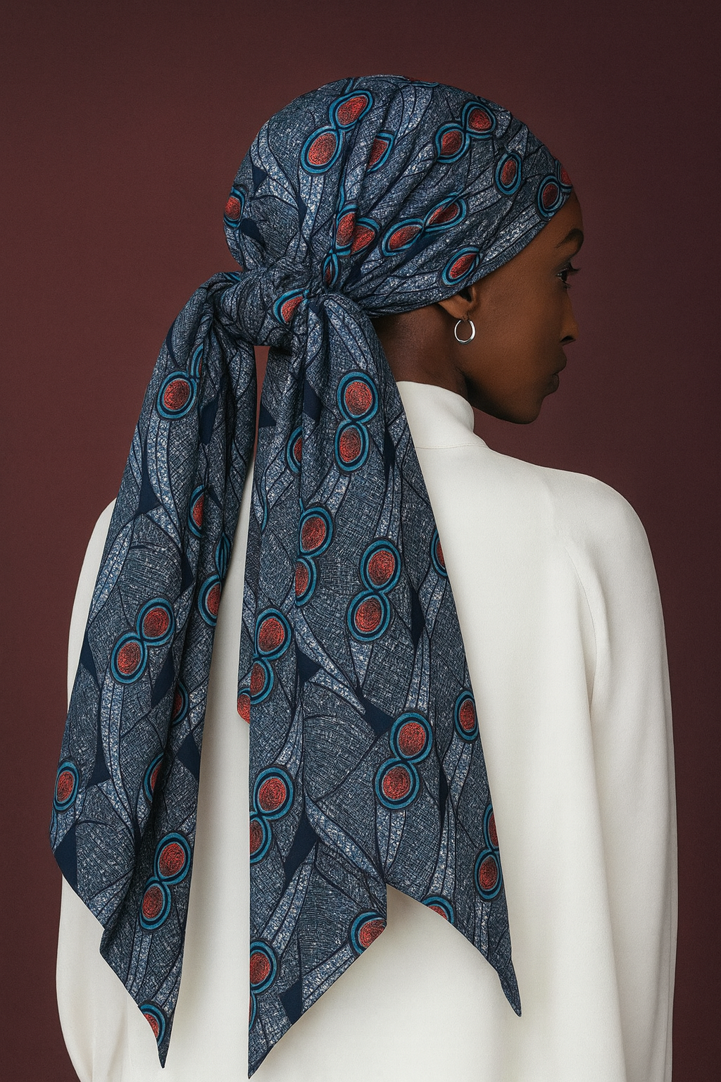 Son motif circulaire en mouvement, mêlant bleu nuit, turquoise lumineux et rouge corail, apporte une intensité visuelle unique. Polyvalent, fluide et structuré, il convient aussi bien à la couture traditionnelle qu’aux silhouettes contemporaines : robes, ensembles, boubous, jupes, chemises oversize ou accessoires.